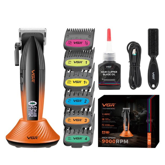 Акумуляторна машинка для стрижки VGR V-889C— професійний прилад з потужним мотором 9000 RPM, керамічними та MIM-лезами та часом автономної роботи до 250 хвилин. LED-дисплей показує оберти, заряд та стан роботи. Регулятор довжини 0.8-2 мм без насадок дозволяє виконувати фейди і точну окантовку. У комплект входять 6 насадок від 1,5 до 13 мм. Стильний дизайн, висока потужність та великий акумулятор роблять модель ідеальною як для барберів, так і домашнього використання.