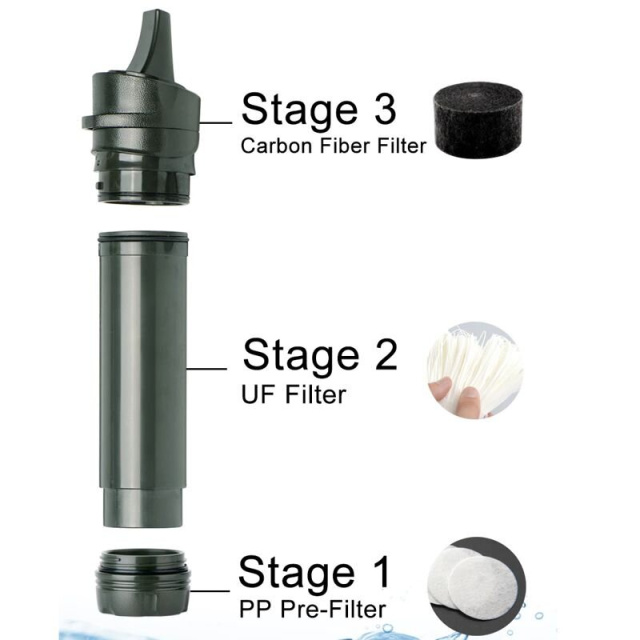 У своєму корпусі портативний фільтр для очищення води має 3 рівня фільтрації, а саме: фільтр грубої очистки від механічних домішок, UF фільтр з медичного полого волокна тонкого очищення і вугільний фільтр. Цей переносний фільтр для води розрахований на фільтрування до 1000 літрів води, що вистачить на кілька років походів. Усмоктувальна частина фільтра містить різьблення, розраховане на пряме приєднання звичайних пластикових пляшок, а зворотна сторона виконана у вигляді носика для зручного пиття або прямого всмоктування води з джерела і закривається кришкою.