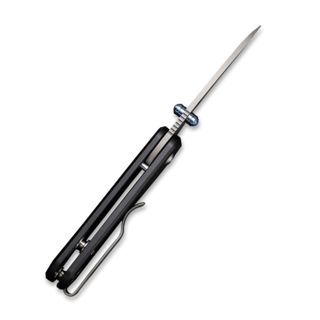 Клинок із прямим заточуванням розкривається за допомогою шпеника, який виготовлений з титану 6AL4V з блакитним покриттям. Фіксувальний механізм — стандартний замок liner lock, є керамічний кульковальник. Додатковий комфорт експлуатації забезпечують рифлений упор під палець на обуху та виїмка під вказівний палець, що захищає від зісковзування руки на лезо.
