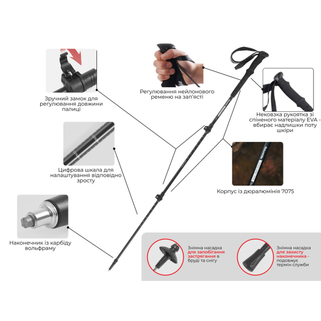 Розмір усадки-62 сантиметри, розмір в повну величину-135 сантиметрів. Матеріал-дюралюміній 7075. Міцна, гнучка і зносостійка палиця для трекінгу.