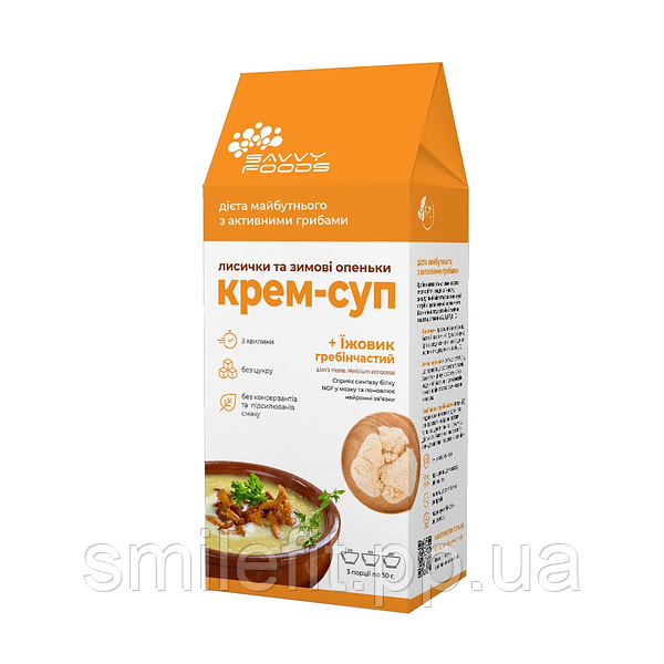 Що всередині: горохове пюре сухе 64%, гриби сухі подрібнені (лисички, опеньки зимові, їжовик гребінчастий), цибуля суха, молоко сухе, вершки сухі, неактивні дріжджі сухі, сіль гімалайська рожева.