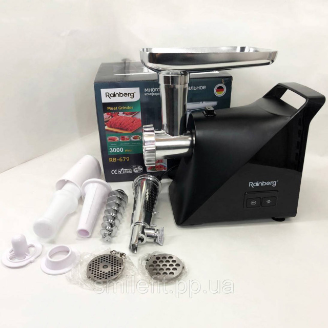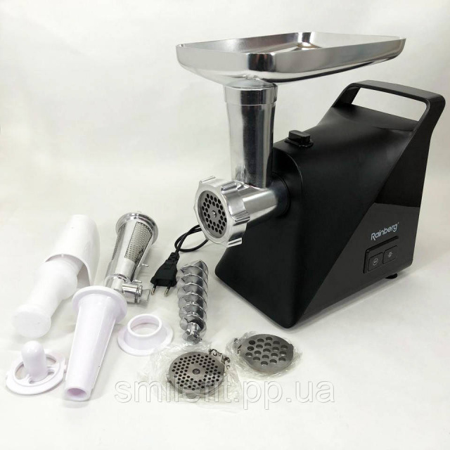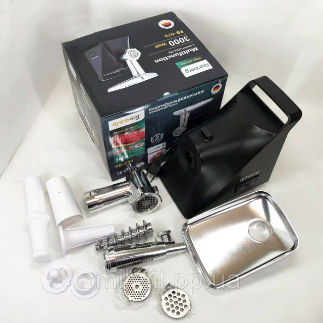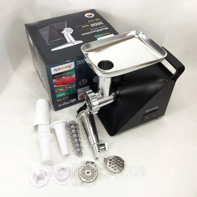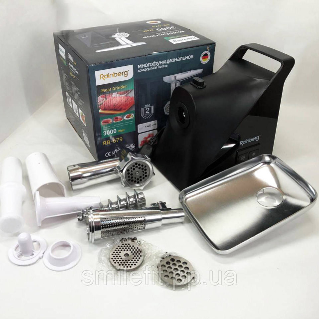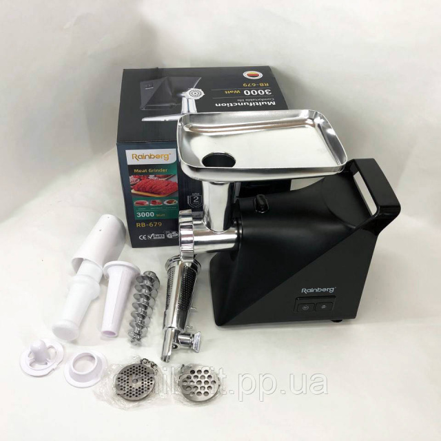 Новинка від виробника Rainberg – компактна, надійна, потужна електрична м’ясорубка RB-679 із функцією придушення шуму. Потужність 3000 Ватт. Здатна перемолоти м’ясо, рибу, овочі, а також приготує сік або морс, домашні ковбаски та таксі.