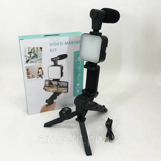 У набір входить: мікрофон, підсвічування, трипод, тримач для телефону та Bluetooth кнопка.