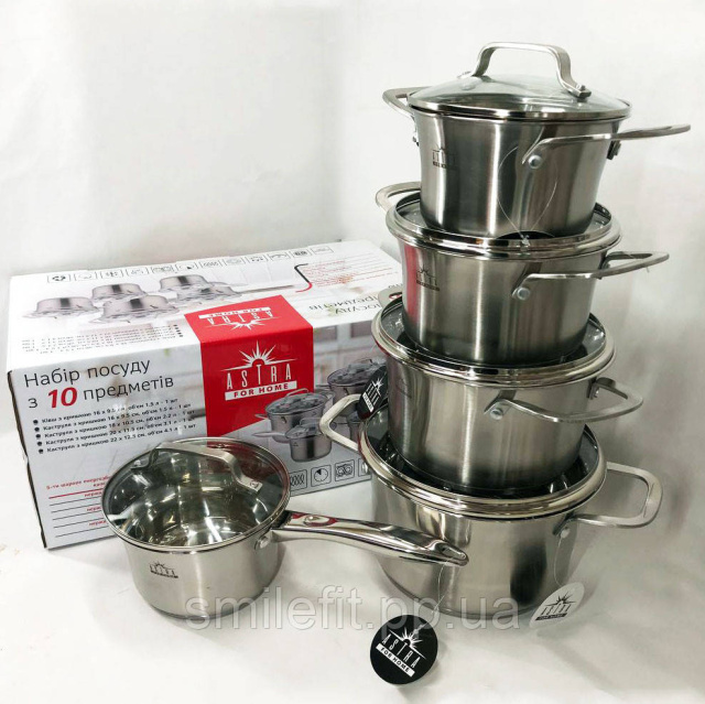 Набір посуду ASTRA виготовлений з високоякісної нержавіючої сталі 18/10 (18% Хром & 10% Нікель) такий матеріал робить набори міцними і довговічними. Посуд на відміну від інших видів металевого посуду не впливає на смак їжі, що готується. Всі ємності мають дзеркальне полірування зовні та матове всередині. П’ятишарове капсульне дно не деформується при нагріванні і забезпечує швидкий і рівномірний розподіл тепла. Ручки каструль клепні, зручно розташовані, ергономічні. Скляні кришки з отвором для виходу пари дозволять контролювати весь процес приготування в оптимальному режимі.
