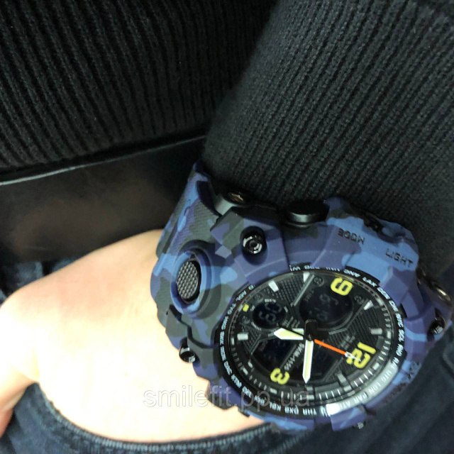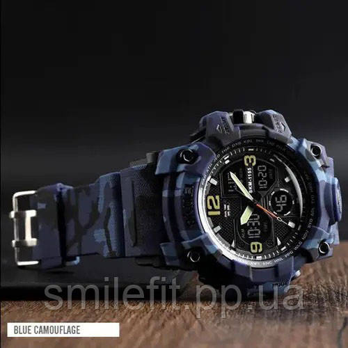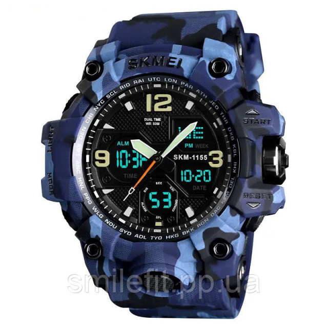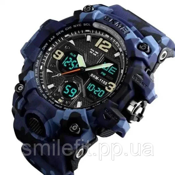 Годинник SKMEI 1155BCMBU створений для тих, хто цінує агресивний дизайн і потужний функціонал. Його синьо-чорне камуфляжне забарвлення одразу привертає увагу та вигідно вирізняє серед інших моделей. Великий циферблат поєднує аналогову та цифрову індикацію, що робить годинник не лише практичним, а й візуально ефектним.