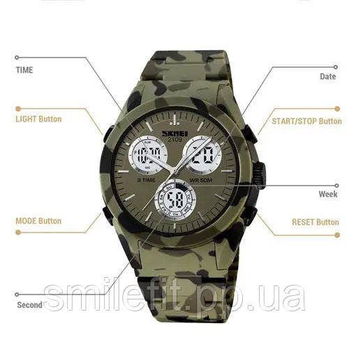 SKMEI 2109CMGN — це годинник, що створений для тих, хто не боїться виділятися. Його камуфляжний корпус і ремінець роблять цей аксесуар ідеальним для поціновувачів військового стилю або активного способу життя. Завдяки унікальному дизайну й поєднанню аналогового та цифрового дисплеїв, модель виглядає сучасно та функціонально.