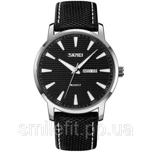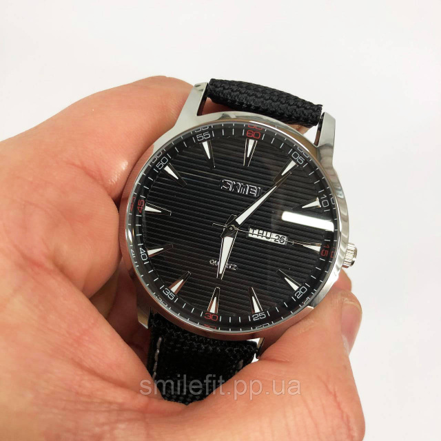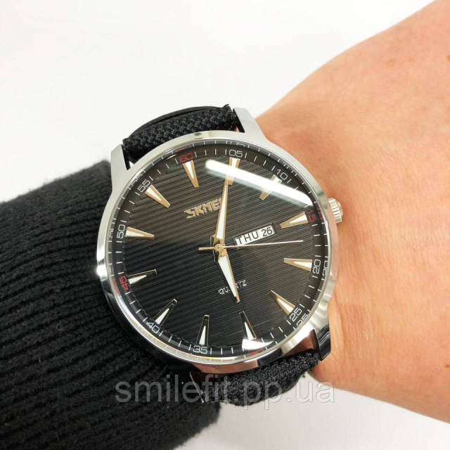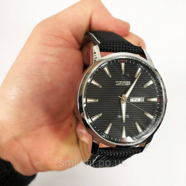 Годинник SKMEI 9303SIBK — це стильна класика для тих, хто цінує елегантність і лаконічний дизайн. Стриманий чорний циферблат з вертикальною текстурою доповнений сріблястим корпусом, а мітки годин гармонійно поєднуються з витонченими стрілками. Завдяки поєднанню тканинного ремінця з контрастною строчкою, модель виглядає сучасно та легко адаптується під будь-який образ.