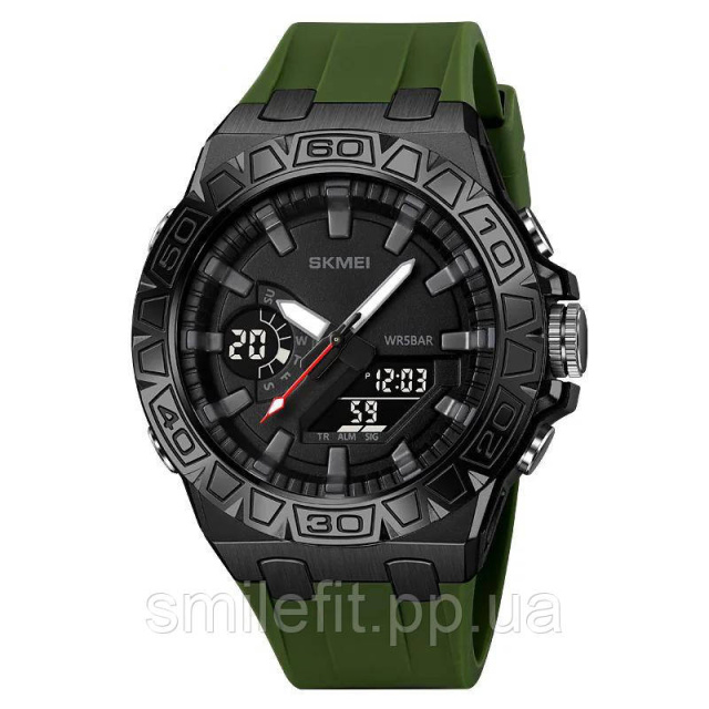 SKMEI 2276AG — це стильний чоловічий годинник із виразним дизайном та сучасним функціоналом, який підійде як для міського стилю, так і для активного використання. Поєднання стриманого чорного циферблату з оливковим ремінцем створює ефектний контраст, а масивний безель із гравіюванням підкреслює мужній характер моделі. Аналогова індикація гармонійно доповнюється цифровими дисплеями, що додають зручності в повсякденному користуванні.