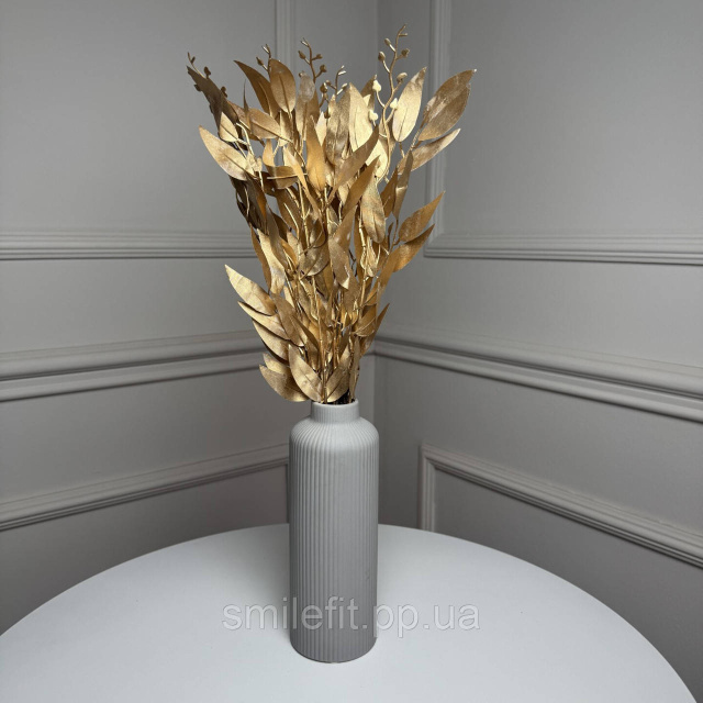 Штучний букет рускусу в золотому кольорі виглядає ефектно і благородно завдяки витягнутому листю з м’яким металевим блиском. Тонка форма гілок та акуратна текстура листя створюють елегантний силует, який добре виглядає як у одиночній вазі, так і у складі декоративних композицій. Золотий відтінок додає декору виразності та візуально підкреслює деталі інтер’єру.